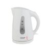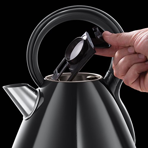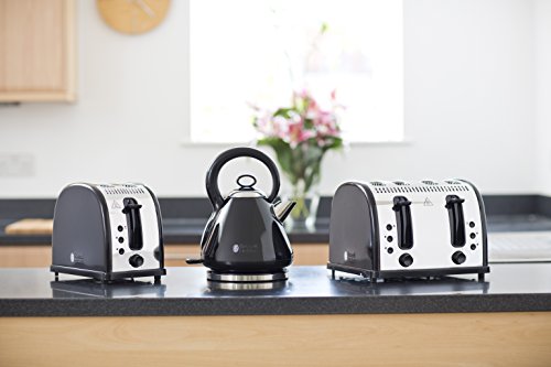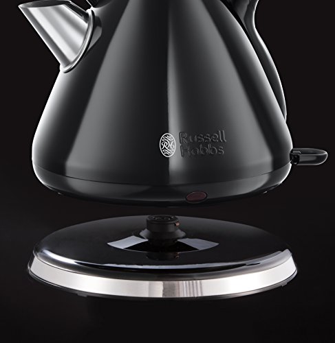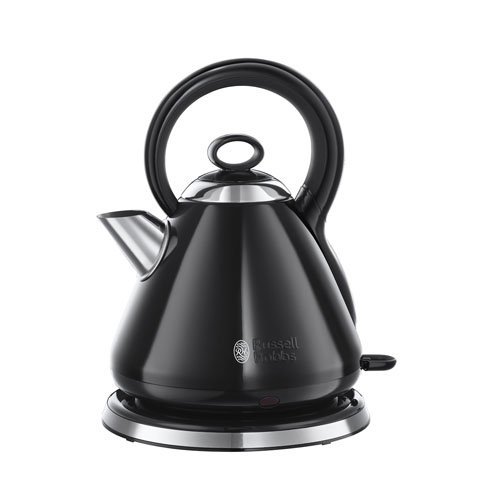 Polished stainless steel kettle with metallic black accents and Russell Hobbs logo embossed